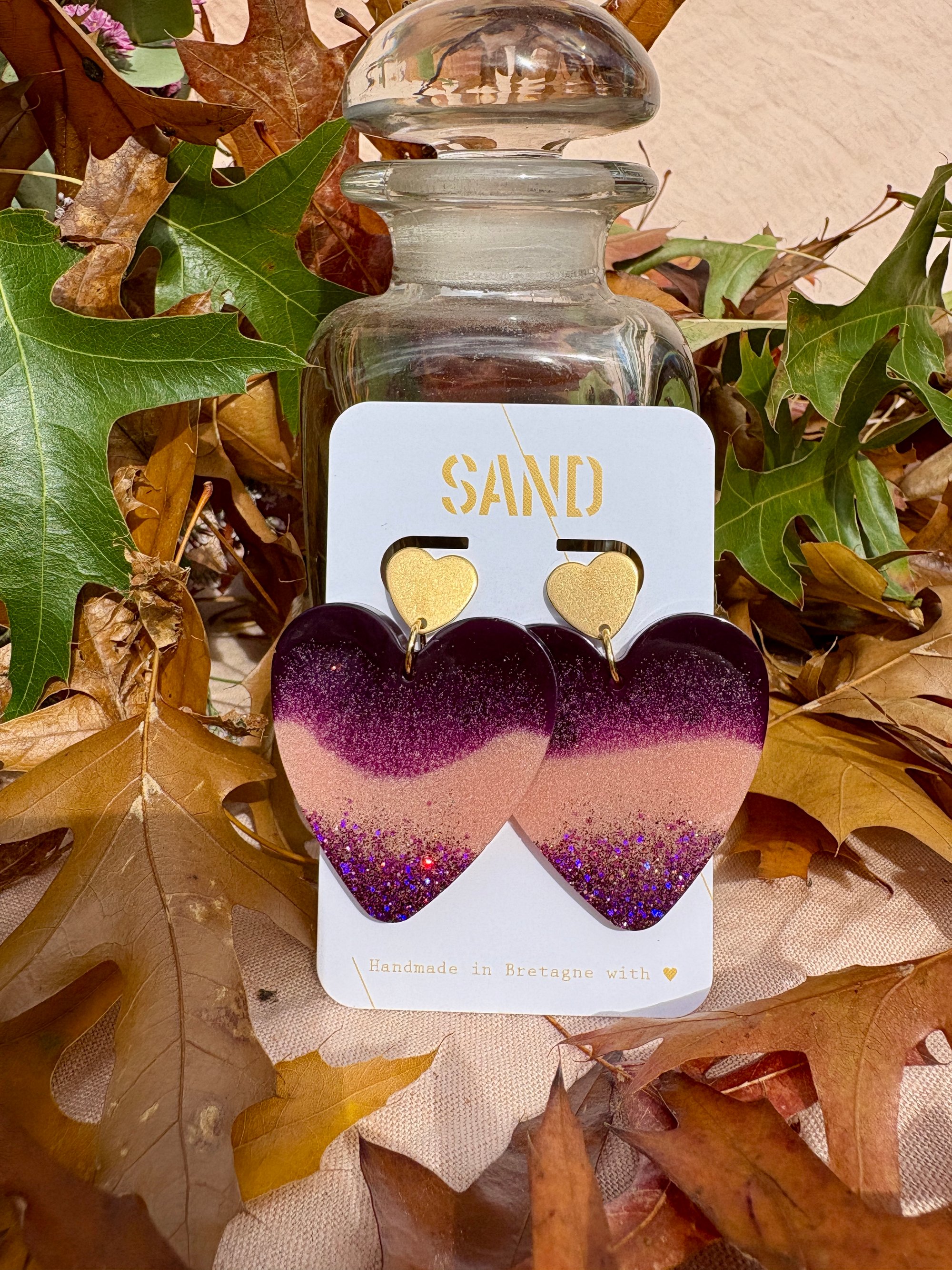 Paire de boucles d’oreilles réalisée en résine bio avec une attache cœur en acier chirurgical.