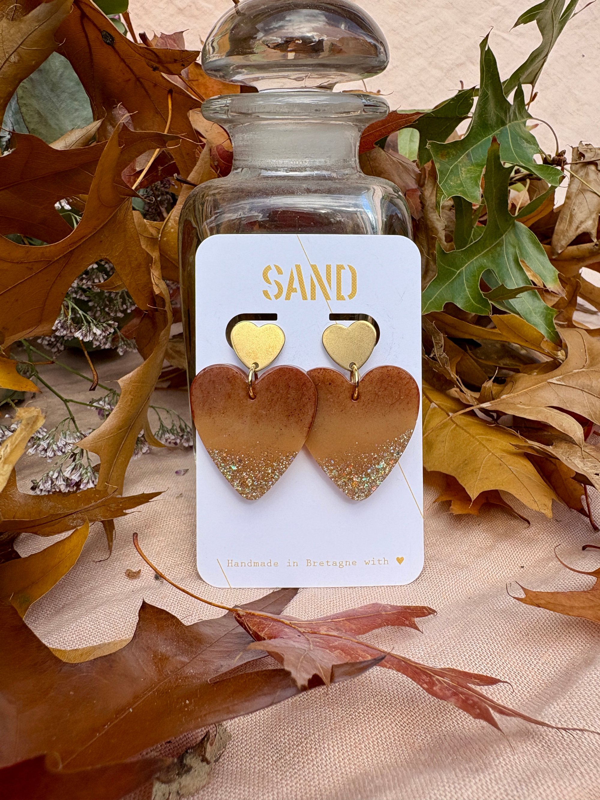 Paire de boucles d’oreilles réalisée en résine bio avec une attache cœur en acier chirurgical.