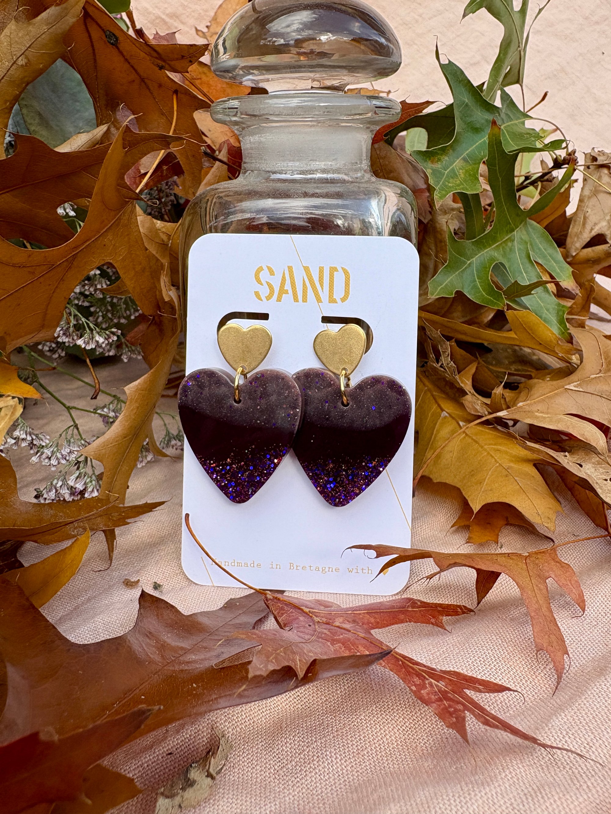 Paire de boucles d’oreilles réalisée en résine bio avec une attache cœur en acier chirurgical.
