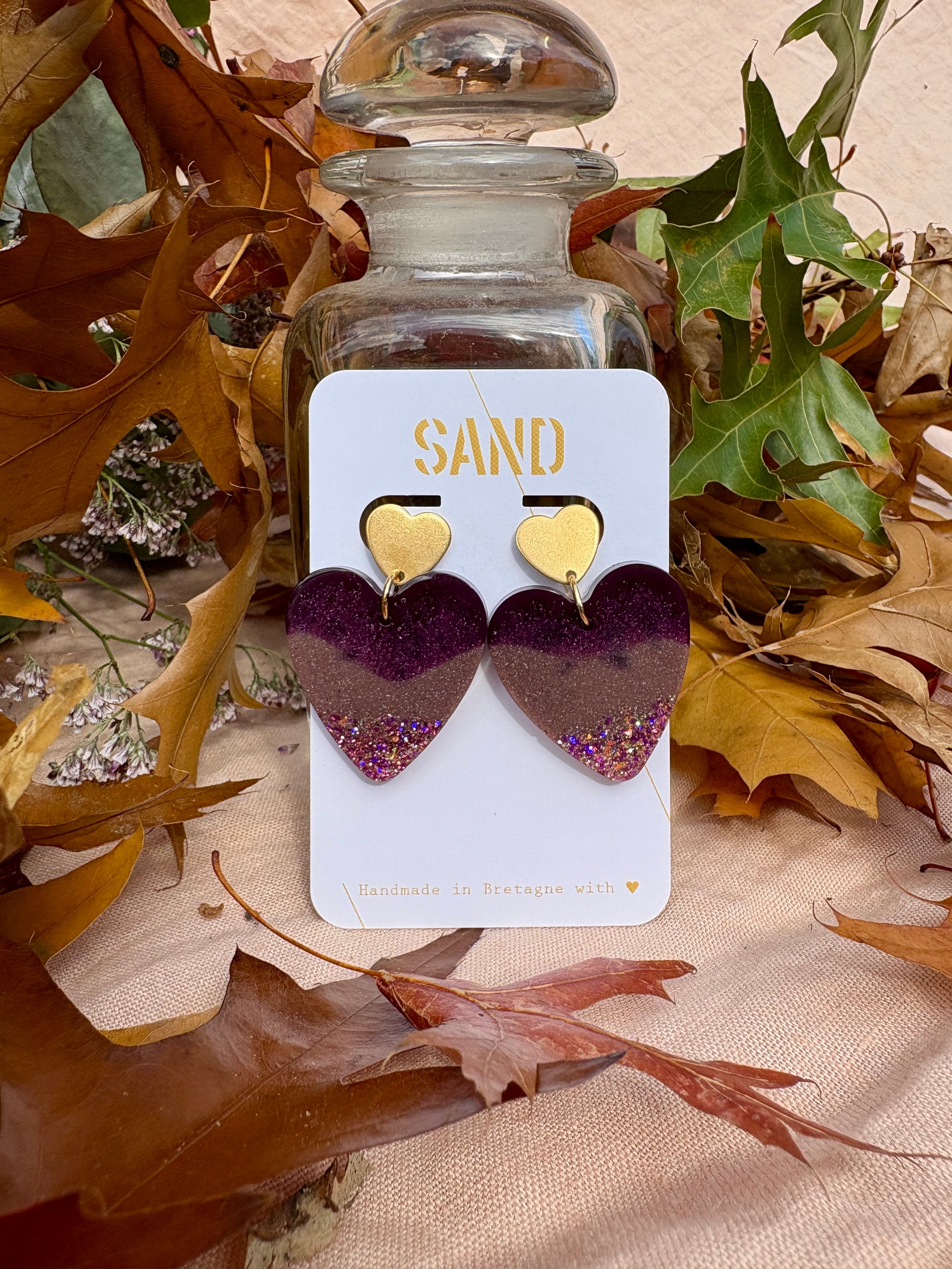 Paire de boucles d’oreilles réalisée en résine bio avec une attache cœur en acier chirurgical.